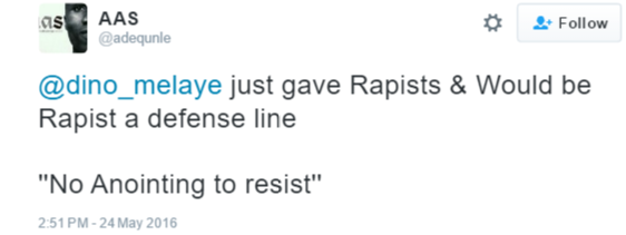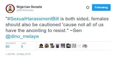 During the second reading of the Bill which addresses the prohibition of Sexual Harassment of students in Tertiary Education Institutions, Senator Dino Melaye was quoted to have said, Sexual Harassment Bill is both sided, females should also be cautioned ’cause not all of us have the anointing to resist’. Nigerian Twitter Users have reacted to this statement which they feel is in defence of men who sexually assault women based on such a flimsy excuse. More tweets after the cut…