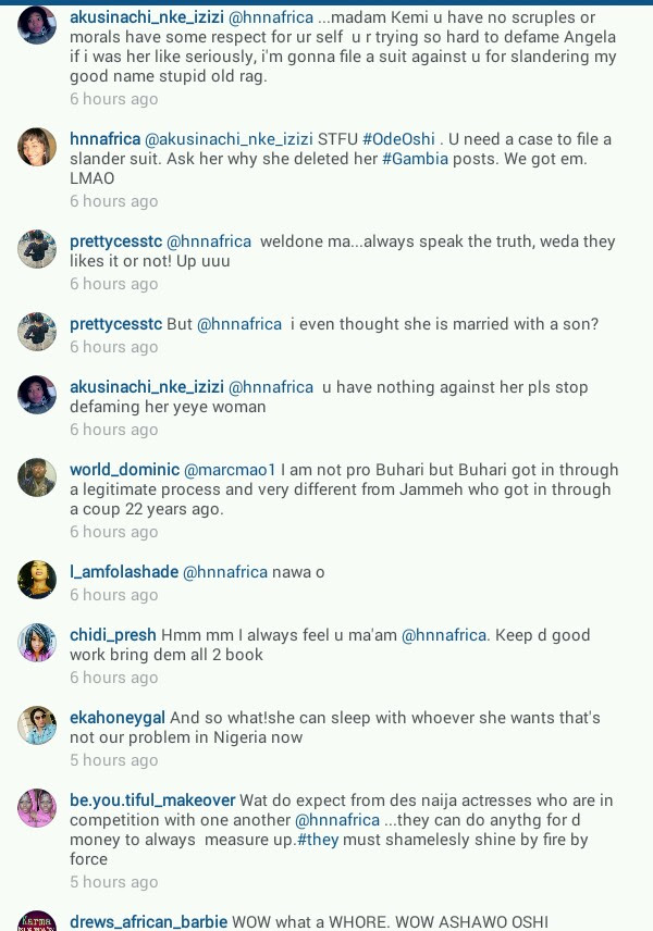 ‘The depth of high class prostitution of our Nollywood ladies has reached alarming heights. While AngelaOkorie fans are busy yapping me for calling her a call girl, they don’t understand my form of investigative journalism. I am simply the BEST in Africa. I was US trained and my degree is journalism not mass communications. No fear, favors or bribes. Okorie has been fucking a dictator in front of our eyes and could have possibly been a diplomatic nightmare that ECOWAS secret agents could have easily eliminated. If she were American, the CIA would have KILLED her already! A total Nigerian embarrassment to muhammadbuhari’s ECOWAS mission. I caught and monitored Okorie’s philandering with yahyajammeh from the beginning of the elections that eventually earned AdamaBarrow the Presidency. Instead, Okorie was on Instagram brainwashing her fans as usual calling Jammeh “a man of the people.” Angela once again after u were insinuating thunder will fire bobrisky222 , I repeat.the thunder that will fire u is coming straight from Gambia from all those Gambians who are refugees in Senegal now suffering and trying to go home. Instead you conveniently flew back to Nigeria and watched a dictator refuse to give up his throne after he paid u. A prominent Gambian Journalist told me you were paid $1.5M to wear white muslim dictator poo garb and rock your pussy around campaigning for an evil man. RETURN THE MONEY ANGELA! Jammeh also allegedly took $11M too. Both of u will be prosecuted by Barrow soon’