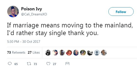 » I Will Rather Be Single Than Move To The Mainland- Twitter User